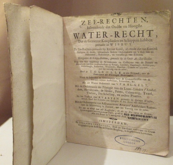 Zee-Rechten, Inhoudende dat Oudste en Hoogste Water-Recht,. Dat de Gemeene Kooplieden en Schippers hebben gemaakt in Wisbuy. De Zee-Rechten gemaakt by Keyzer Karel, als mede die van Konink Philippus de derde ... Midsgaders de Schips-Rechten, gemaakt by de Oude An-Zee-Steden.Nog zyn hier bygevoegt de Willekeuren en Costuyme van de Buyten en Binnelands-vaarders van Amsterstam op Rouan, Londen, Hamburgh, Antwerpen, Middelburgh, Rotterdam, Dordrecht, Haarlem, Utrecht en Leyden, met het vervolg van de zelve, Noch de Tol-Rolle in den Orizondt, voor de Onderdanen der Vereenigde Nederlanden. Noch de Instructie en Ordonnantie voor de Commissarissen van de Zeevaart binnen Amsteldam, Rorterdam, &c. Met een Nieuwe Ordonnantie van't Paal-Gelt. Met de Ordonnantie der Pilotagie van de Loots-Luyden t'Amsteldam, Huysduynen ... en andere Plaatsen. En het Tractaat van Avaryen gemaakt by Quintyn Weytsen ... Met de Ordonnantie van Asseurantie en Avarye t'Amsteldam Rotterdam en Milddelburg in Zeeland ... Tot nut en dienst van alle Kooplieden ... op alle de Articulen by A B C gestelt ... 7 Teile in 1 Band. Amsterdam, Johannes van Keulen (1695). Kl.-4to. 4 Bll. (Titel u. 3 Bll. Register), 124, 40, 12,. 1695. 26 S., 8 Bll., 40 S. Späterer Karton. Catalogus Nederlandsch historisch scheepvaart Museum S. 943.- Seltene Ausgabe einer Sammlung von Texten zum Seerecht, die bis ins 18. Jahrhundert hinein vielfach übersetzt und wiederaufgelegt wurden.- Einband etwas beschabt, handschriftlicher Titel auf Deckel, vorderer Vorsatz mit Besitzvermerk von alter Hand, leicht gebräunt, wenige Blatt stärker braunfleckig, Papier leicht wellig, gering stockfleckig.