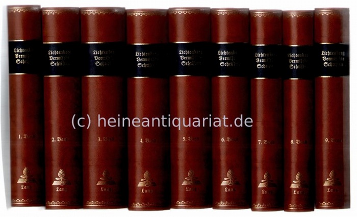 Vermischte Schriften nach dessen Tode aus den hinterlassenen Papieren gesammelt und herausgegeben von Ludwig Christian Lichtenberg und Friedrich Kries. 9 Bände. Bern, neu-verlegt bei Herbert Lang, 1972. (16 x 10 cm); kl.-8°; Orig.-Kunstlederbände. Nachdruck der Ausgabe Göttingen, Johann Christian Dieterich 1800-1805. Der aktuelle Neupreis beträgt zur Zeit EURO 451,20.