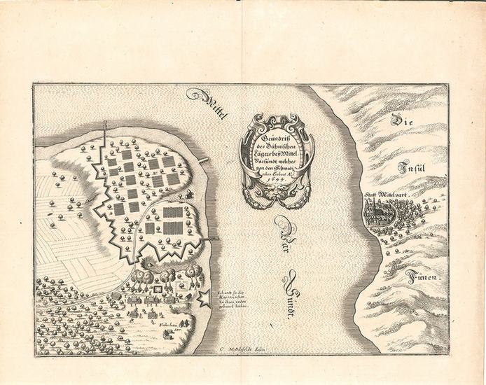 Grundriß des Dähnischen Lagers bey Mittelvarsundt welches von den Schwedischen Erobert A° 1644. [ca. 1645]. Kupferstich. 21,5 x 31,5 cm (Bildauschnitt). Bugfalte. Schlachtplan aus dem Dreißigjährigem Krieg mit Ansicht von Middelfart (Dänemark).