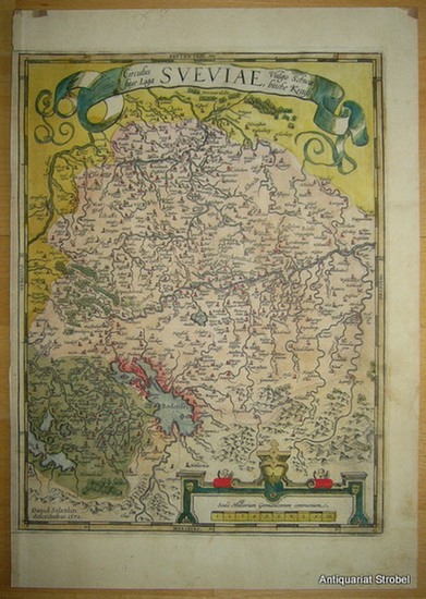 "Circulus siue Liga Sveviae, Vulgo schwabische Kraiß. Dauid Seltzlin describebat. 1572". Kolorierte Kupferstichkarte. Antwerpen, Abraham Ortelius, 1573. Blattgröße ca. 38,8 x 27 cm. Wichtige und einflußreiche Schwabenkarte (Bildgröße 32 x 24 cm) des Ulmer Schul- und Rechenmeisters Seltzlin in der gestochenen Fassung aus Ortelius' "Theatrum orbis terrarum": "Dieser Karte verdankt es Seltzlin, daß sein Name über die Jahrhunderte lebendig blieb" (Oehme, Kartographie des deutschen Südwestens, 31). - Zeigt Schwaben zwischen Rhein, Odenwald und Lech, im Süden bis Chur. - Etwas gebräunt, im Rand gering fingerfleckig, im Oberrand kleine Montagespuren.