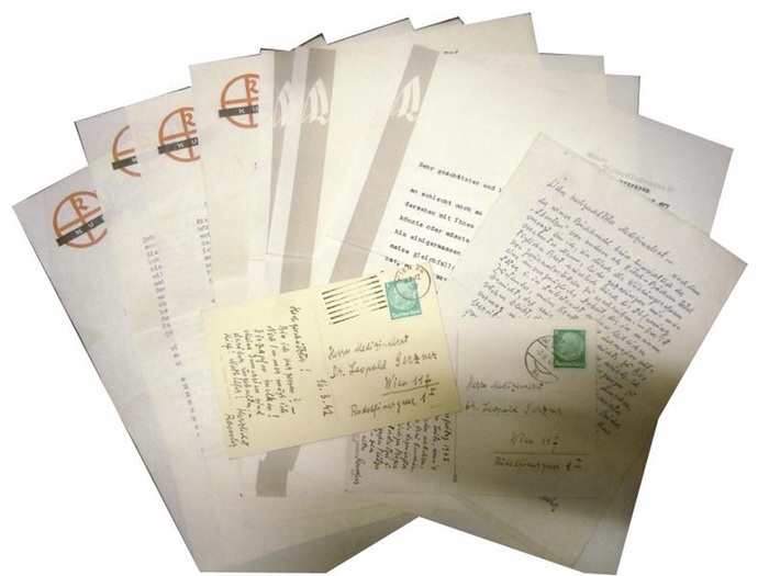 Konvolut aus 9 Briefen und 2 Postkarten. _. Roessler, Arthur, Kunstkritiker und Kunstschriftsteller (1877-1955). 9 Briefe (davon 6 eigenh.) und 2 eigenh. Postkarten, allesamt mit Unterschrift. Eine Postkarte aus Hildesheim, die andere o. O. - Briefe: Wien. Ein Brief undatiert, die anderen 23. XII. 1934 - 3. IV.1942. 4° (28x22 cm), zus. 9 Seiten. Bis auf den undatierten Brief allesamt mit persönlichem, gedrucktem Briefkopf; alle gerichtet an den Medizinalrat Leopold Serzner in Wien. 1. (Undatierter Brief:) "nach dem der wiener Buchhandel heuer hinsichtlich des "Absatzes" von anderen als Kitsch-Büchern total versagt bin ich, ein durch die Währungsreform verahmter Mann, leider gezwungen mir mein tägliches Brot neuerlich durch die Abfassung von Journalartikeln zu erschreiben [...]" - Weiter Klage über seinen körperlichen Zustand und Kommentar zu einem Buch, welches Roessler Serzner geschenkt und dem Brief wohl beigelegen hat. - 2. (23. XII. 1902:) Brief zu einem Aquarellbild von Johannes Hepperger, welches Roessler Serzner zu Weihnachten geschenkt hat, auf das nicht näher eingegangen wird. - 3. (28. V. 1935:) Brief mit der Bitte um Verschreibung einer Arznei:"Ad Salbe erlaube ich mir die Frage, ob es nicht auch eine weisse gibt, denn die letzthin verordnete, die wie Kinderscheisse aussieht, ...)" - 4. (21. II. 1936:) Nachfrage wegen einer Kurbewilligung für Ehefrau Ida Roessler. - 5. (1. IV. 1939:) Beschwerden über Ohrschmerzen, welche seiner Meinung nach nicht akkurat behandelt werden. - 6. (1. II. 1940:) Bitte um Unterzeichnung damals beiliegender Krankenscheine und um Verordnung von Milch und Butter für ihn und seine Frau. Unterzeichnet mit "A. Roessler, dzt. Aschenputtel und Chefkoch-Anwärter" 7. (11. III. 1943:) "[...] ich lasse nicht deshalb nichts von mir hören und sehen, weil?s mir "so" gut geht, sondern deshalb nicht, weil ich intensiv damit beschäftigt bin, mich zu liquidieren. Aber das interessiert Sie kaum, was ich durchaus begreiflich finde, habe ich doch selbst nur ein sehr herabgemindertes Interesse an mir, dieser schäbige Rest, veranlasst mich jedoch Sie zu bitten, neuerdings um Lebensmittelzubussen für mich anzusuchen [...]" - 8. (28. IV. 1943:) Mockierung über die Identifikation mit einer Person namens Haberditzl, erneute Bitte um Lebensmittelzuschüsse. - 9. (XII. 1943:) Frage, ob das Ehepaar Roessler beim Ehepaar Sezner Weihnachten verbringen kann, mit Zitat von Wilhelm von Humboldt: So lange man lebt, muß man das Leben erhalten, sich ihm nicht entfremden, sondern darein eingreifen, wie es die Kräfte u. die Gelegenheit erlauben." - (Postkarte 16. III. 1942:) Hochgeschätzer! Bin ich vergessen? - Noch immer muß ich Eiszapfen melken! Meine Innereien sind darüber ungehalten. - Hilf! Nothelfer! [...]" - (Postkarte 3. IV. 1942:) Wunsch für eine reichhaltige Osterjause. - Arthur Roessler war Kunstschriftsteller, Publizist, Galeriedirektor (Galerie Miethke) und Vizepräsident der Wiener Werkstätten und des Österreichischen Werkbundes. Er gilt als Entdecker und Förderer Egon Schieles. Einmalige Unterstreichung in Buntstift. Auf der Versorseite eines Briefes Bleistiftnotizen. Ein anderer Brief mit spärlichen Tintennotizen. Sonst sehr guter Zustand.