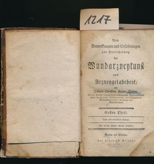 Neue Bemerkungen und Erfahrungen zur Bereicherung der Wundarzneykunst und Arzneygelahrheit + Unterricht für die Unterwundärzte bey den Armeen, besonders bey dem Königlich-Preussischen Artilleriecorps Berlin, Nicolai, 1776+1778. Hldr, 208+334S, beise in einem Band, berieben, Rücken fehlt teilw., sonst gutes Exemplar.