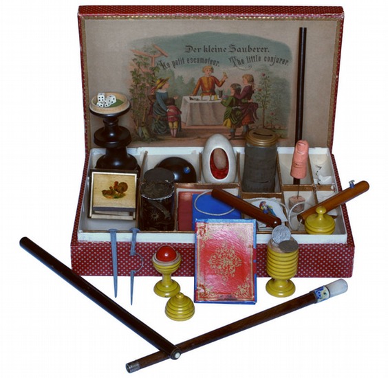 Der kleine Zauberer. Le petit escamoteur. The little conjurer. Wahrscheinlich Deutschland, um 1889. Kassette aus Holz und Pappe (315:209:67 mm) mit Buntpapierbezug und originaler chromolithogr. Deckelillustration. Goldbordüre. Vollausstattung. Ungewöhnlich vollständiger und wohlerhaltener Zauberkasten des späten 19. Jhs. Enthält ein 32-teiliges Miniatur-Spielkartenset (ein Blatt leicht überformatig); eine Würfeldose mit doppeltem Boden (gedrechseltes Ebenholz, mit vier Würfeln); zwei Vasen mit doppeltem Boden (einer mit roter Kugel, die andere mit falschen Münzen und verborgenem weißem Pulver; lackiertes, gedrechseltes Holz); ein falsches Ei, hohl und mit Seidenbändern; zwei Eisennägel, einer präpariert; eine Holzkugel auf Bindfaden; ein Set von Holzgriffen auf Bindfaden; ein falscher Zeigefinger aus hautfarbenem Wachs, auf lange Nadel gespießt; eine handbemalte Holzschachtel mit doppeltem Boden; eine Zinndose mit Schlitz; ein dreiteiliges Set für Zylindertrick; ein Set kleine Papierabschnitte im Briefchen, jeweils in Buntpapier eingewickelt; eine Zauberbrieftasche; drei Zauberstäbe, einer mit aufwendiger Spitze. - Mehrere der empfindlichen Papierböden der Kassettenfächer durchgerissen, jedoch inshesamt in gutem Zustand; ein oder zwei Zaubertricks und -stäbe anscheinend aus einem anderen Kasten hinzugefügt, wie der Platzmangel im vorliegenden Kasten nahelegt.