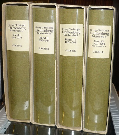 Briefwechsel. Hrsg. v. Ulrich Joost u. Albrecht Schöne. Band 1-4 (von 5). (München), C. H. Beck, (1983-1992). Gr.-8vo. XLIII, 1077; XI, 1018; XV, 1291; XVI, 1088 S. Grüne OLwd. m. Deckel u. Rückenschild sowie Transparentumschlag im OPp.-Schuber. Band I: 1765-1779; Bd. II: 1780-1784; Bd. III: 1785-1792. Bd. IV: 1793-1799 und Undatiertes. - Es erschien noch ein Register in zwei Teilbänden. - Verlagsfrische Bände.