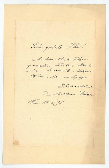 Eigenh. Brief mit U. Wien, 20. I. 1898. ? S. 8vo. An einen namentlich nicht genannten Adressaten, der sich offensichtlich um ein Autogramm an Ihn gewandt hatte: "Antwortlich Ihrer geehrten Zeilen komme ich hiemit Ihrem Wunsche entgegen [...]". - Alt auf Trägerkarton montiert; minimal fleckig.