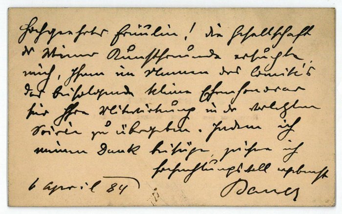 Eigenh. Visitenkarte mit U. [Wien], 6. IV. 1885. 1 S. 64 x 105 mm. An eine namentlich nicht genannte Adressatin: "Die Gesellschaft der Wiener Kunstfreunde ersuchte mich, Ihnen im Namen des comités das beifolgende kleine Ehrenhonorar für Ihre Mitwirkung in der Soirée zu übergen [?]".