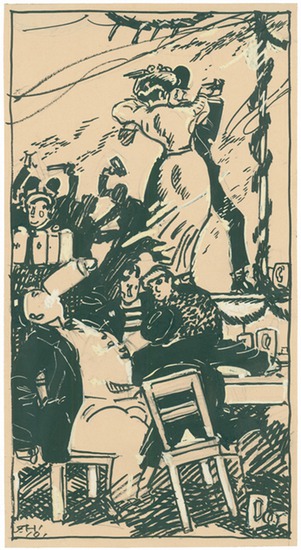 Tanz - Unterm Maibaum. _. Tuschpinselzeichnung, Bleistift, Deckweiß. Monogrammiert. 28,1:15,2 cm. Literatur: Simplicissimus. Bilder aus dem ?Simplicissimus?. Hrsg. von H. Reinoß, Hannover, 1970, S. 158, 194, 196; Flemig, S. 117. Maler, Zeichner, Illustrator, Mitarbeiter ?Simplicissimus? und ?Jugend?.