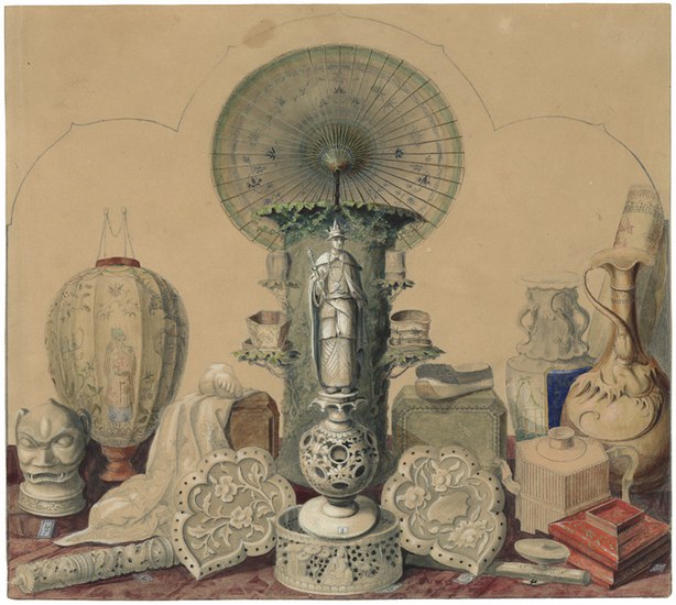 Chinesische kunstgewerbliche Gegenstände aus Elfenbein u.a.. _. Aquarell über Bleistift, mit Deckweiß gehöht, auf bräunlichem Velin. 21,5:24,3 cm. - Etwas fleckig. Auf altem Untersatz bezeichnet: ?A. Hauptstock in Berlin / Ausstellung chinesischer Gegenstände in Berlin / Reiche Gruppe chinesischer Elfenbeinschnitzereien / und anderer Kunstprodukte. / Aquarell, qu. fol. / des J.G. Lumnitzers Nachlasse zu Brünn. N=208632?. Lumnitzer war in seinem Hauptberuf evangel. Theologe und Erzieher und als Superintendent in Mähren tätig. Als Maler war er Dilettant und zeichnete vor allem Porträts historischer Persönlichkeiten. Kulturhistorisch interessante Darstellung!.