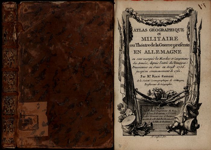 Atlas géographique et militaire ou Théatre de la Guerre presente en Allemagne ou sont marqués les marches et campements des armées, depuis l'entrée des trouppes Prussiennes en Saxe en Aoust 1756. Jusqu'au commencement de 1762 Paris, Ballard, [ca. 1762]. 12°. 13 cm. [39] Blatt. Lederband mit goldgeprägtem Rückentitel. Französischsprachige Ausgabe. Karten teilkoloriert. Einband mit deutlichen Gebrauchsspuren. Hinteres Vorsatzblatt und letztes leeres Blatt mit Ausriss. Karten in sehr gutem Zustand. French language edition. Cover with traces of usage. Endpaper an last blank shett with cut out. Maps in fine condition. Good copy.