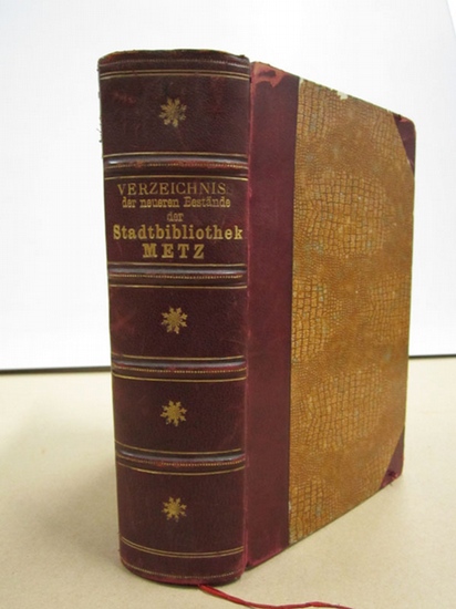 Verzeichnis der neueren Bestände der Stadtbibliothek Metz. Erster Teil: Schöne Literatur - Allgemeines und verschiedenes. Catalogue des ouvrages modernes de la Bibliothèque Municipale de Metz. Première Partie: Belles Libres - Ouvrages généreaux et divers. Buch- und Steindruckerei Even, Metz., (1913). XIX, 1078 S. 8°, OHLeder. Laut handschriftlichem Vermerk handelt es sich hier um das Handexemplar des Verfassers, der der Direktor dieser Bibliothek war. Innen zusätzlich mit dessen Wappen-Exlibris sowie seinem Namensstempel. Einband berieben / bestoßen, ansonsten gut. The own copy of Dr. Kunz von Brunn genannt von Kauffungen, who was the director of this library and also author of this book. Inside his inscription,. Exlibris, and stamp. Cover / edges with some wear, else fine.