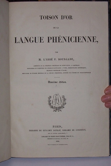 Toison d'or de la langue phénicienne. Deuxième édition. Mit 22 teils mehrfach gefalteten lithographischen Tafeln. Paris: Benjamin Duprat et Firmin Didot Frères, Fils et Cie. 1856. Quart, 34,7 cm. (Einband an den Kanten etwas berieben; innen teils leicht stockfleckig, sonst - und im Ganzen: wohlerhalten.). Mit ganzseitigen gedruckten Widmungen für Sidi Mahammed Bacha-Bey sowie Sidi Achmed Bacha-Bey. François Bourgade (1806 - 1866) war ein französischer Missionar, Linguist und Philosoph. Er war einer der ersten Missionare im mohammedanischen Nord Afrika. Die Erstausgabe des vorliegenden Werkes erschien 1852, es gehört zu den wichtigen frühen Veröffentlichungen über die phönizische Sprache. Second edition. Contemporary blueish-green hard-grain-leather backed boards, five raised bands. Some rubbing to edges of covers. Lightly stained, else very good. Bourgade, french missionary, linguist, and philosopher (1806-1866), was ordained priest in 1832. In 1838 he proceeded to Algeria and to the regency of Tunis. He published « Soirées de Carthage » (1847); « La clef du Coran » (1852); « Passage du Coran â l'Evangile » (1855); the important philological work, « La toison d'or de la langue phénicienne » (1852, 1856); a refutation of Renan's « Life of Jesus »: « Lettre â M. E. Renan » (1864). - Zweite Ausgabe. - RFM - Weitere Bilder auf Anfrage oder auf unserer Homepage.