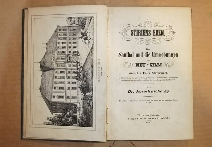 Stiriens Eden. Das Santhal und die Umgebung von Neu-Cilli in der südlichen Unter-Steyermark. In historischer, Topographischer, pittoresker, ökonomischer, industrieller, montanistischer, thermaler, traditioneller und ethnographischer Hinsicht. Wien und Leipzig, Hirschfeld, 1847. 1 Bl., 320 S., 2 Bll. (Inhalt und Verbesserungen). 1 lithogr. Frontisp. und 2 (1 doppelblattgr.) lithogr. Tafeln. 8°. Lwd. des 19. Jahrhunderts (fleckig, Rücken mit kl. Läsur). Erste Ausgabe, selten. - Engelmann 980. Nebehay-W. 925. - Sehr gewissenhafte und ausführliche Monographie über das Sanntal und die südliche Untersteiermark. Enthält Kapitel über die Landesgeschichte, Wirtschaft, Landwirtschaft, Viehzucht, Weinbau, Forstwesen, Jagd, Bergbau, Kurwesen und Bäder, Rechtsprechung, allgemeine und spezielle Topographie der Gegend, Volkskunde, landestypische Sagen usw. - Das Frontispiz und eine Tafel zeigen das Schloß Neu-Cilli, die doppelblattgroße Tafel mit Abbildungen der Maulbeerplantagen zu Pliuna. - Etw. fleckig und gebräunt. Buchblock leicht angebrochen.