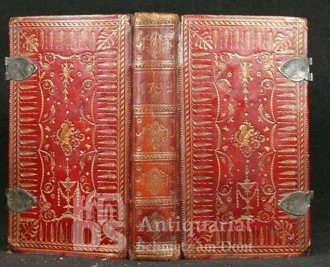 Rider's British Merlin: For the Year of Our Lord God 1792. Being bissextile, or Leap Year. Adorned with many delightful and useful Verities fitting all Capacities in the Islands of Great Britain's Monarchy. With Notes of Husbandry, Fairs, Marts, High Roads, and Tables for many necessary Uses. Compiled for his country's benefit by Cardaunus Rider. [Beigebunden]: The Court and City Register; or, Gentleman's Complete Annual Calendar, For the year 1792; containing I. New and Correct Lists of both Houses of the Seventeebth Parliament of Great Britain, which met for their First Session in November 1790. II. The Court Register. III. Lists of the Army, Navy, Universities, Public Officies, Hospitals &c. With many Improvements, and the Addition of some New Lists. [2 Werke in einem Band]. London, Printed for the Company of Stationers, and sold by R. Horsfield, [bzw.] for J. Joliffe [und 20 andere] [ca 1792]. Schmal-12°. [IV] S., [1] leeres Bl., 60, 24, 22-281 S. Rotes Maroquin der Zeit mit reicher Einbandvergoldung, Goldschnitt, marmorierte Vorsätze. Kanten etwas berieben (ein Gelenk stärker). Rücken mit Lichtspur, Vergoldung dort etwas verblaßt. Schließenbügel fehlen. Steuer(?)-Stempel am Titel. Wenige geringf. Braunflecke, einige kl. Anstreichungen im Rand, insgesamt sehr sauber. Der Index zum 2. Werk vor den 'Rider' gebunden, letzterer in zweifarbigem Druck und teils durchschossen. Der Teil mit dem 'House of Peers' endet mit S. 24 (und B6), der Teil mit dem 'House of Commons' beginnt wiederum mit S. 22 (und C1), - so vollständig.