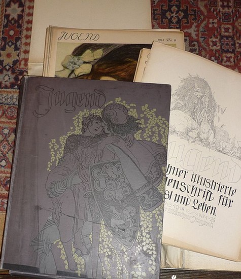 Jugend. Münchner illustrierte Wochenschrift für Kunst und Leben. 1914, Band 1: Nr. 1-26. München, Verlag d. Jugend, 1914. 4to (32 x 24 cm). Mit zahlr., vielfach ganzs., teils farbigen Illustrationen. 2 Bl., 841 S., 1 Bl. 26 Orig.-Einzelhefte in OLwd.-Kassette m. farbig geprägt. Deckelillustr. u. Rückentitel. Vollständiger halber Jahrgang der berühmten Zeitschrift samt Inhaltsverzeichnis (sorgfältig durchgesehen). - Die Mappe etw. lädiert, kl. Fehlstelle im Überzug. Die Hefte teils etw. gebräunt oder angerandert, insgesamt aber wohlerhalten. - In Einzelheften besonders reizvoll.