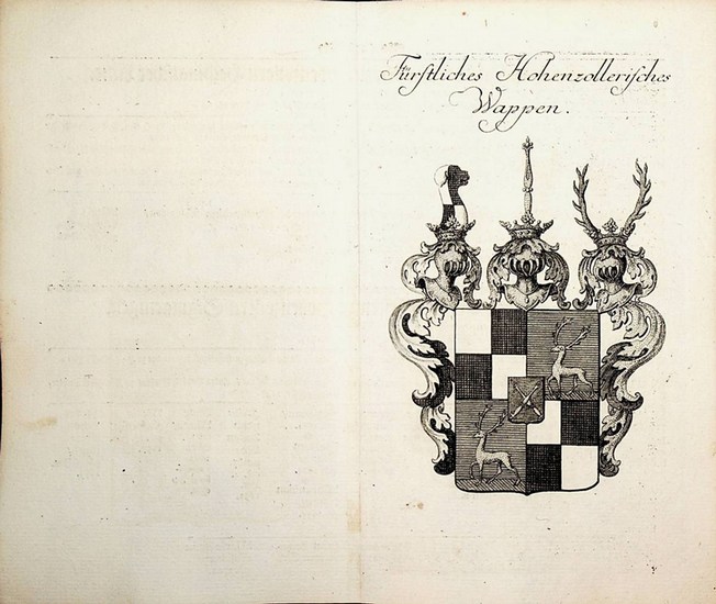 HOHENZOLLERN- F?rstliches Hohenzollerisches Wappen. (aus: Weigel: Durchlauchtigten Welt neu-vermehrter und verbesserter Curieuser Geschichts- und Geschlechts- und Wappen-Calender auf das Jahr nach der Heil-bringenden Geburt Jesu Christi um 1725) N?rnberg, Christoph Weigel, 1725. Kupferstich, Blattgr??e ca. 20 x 24 cm, Verso mit gedruckter genealogischer Stammtafel, Zustand: sehr gut. F?rsten von Hohenzollern.