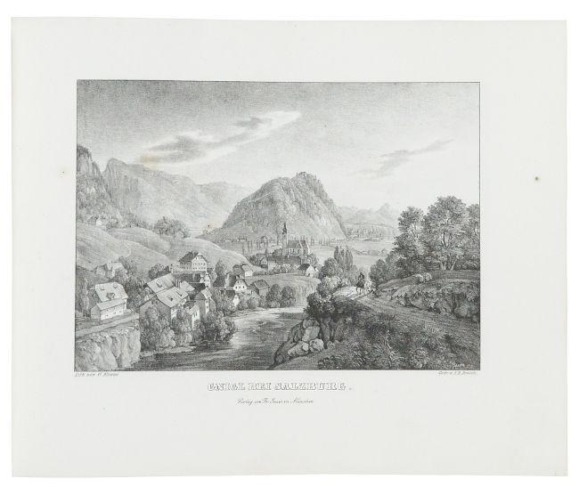 Alpenröslein; oder: Vierundzwanzig malerische Ansichten verschiedener Burgen, Gegenden, Seen etc. im Salzkammergute, dann in den Salzburger-, Berchtesgadener- und Tyroler-Gebirgen etc. Mit erläuterndem deutschen und französischen Texte. München, Joseph Lindauer?sche Buchhandlung (C. T. F. Sauer), 1836. Qu.-4°. Mit 24 lithogr. Tafeln von Gustav Kraus. 21 (1) S., 1 Bl., Beids. illustr. OKart. Erste Ausgabe dieses schönen biedermeierlichen Ansichtenwerkes. Der zweisprachige Text stammt vom bayrischen Schriftsteller Adolph von Schaden, der jeweils eine kurze topographischen Beschreibung der abgebildeten Ortschaften gibt. Die schönen, detailgetreuen Ansichten stammen vom ?Bildberichterstatter der Biedermeierzeit? Gustav Kraus und zeigen u a. Aigen bei Salzburg, Bad Aussee, Berchtesgaden, den Gosausee, den Hallstätter See, Innsbruck, den Königssee (2), Kufstein, Ramsau, Salzburg (4), das Zillertal und die Schlösser Ambras und Tirol. Die beiden hübschen lithogr. Einbandzeichnungen stammen von Franz Seitz. - Der sauber vollständig aufgezogene Orig.-Umschlag etw. fleckig u. berieben. Kl. altes Exlibris a. Innendeckel. Nur min. gebräunt bzw. fleckig. - Nebehay/W. 614; Pressler, Kraus, No. 219-242; Lentner 15049 u. 16926; Deuticke, Salzburg 610; Thieme/B. XXIV, 338.