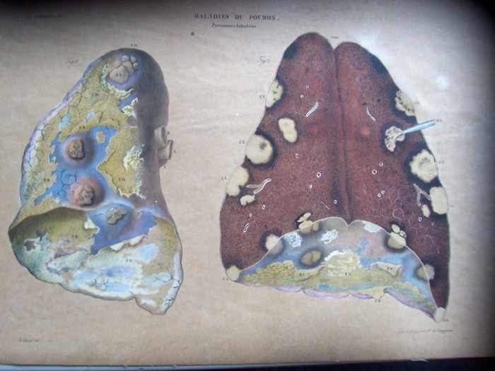Anatomie pathologique du corps humain, ou descriptions, avec figures lithographiées et coloriées, des diverses altérations morbides dont le coorps humain est susceptible. Paris, 1830-1842. Fol. 12 (11 farb.) lith. Taf. Lose in 1 Pp.-Mappe, diese in Hlwd.-Mappe m. Stoffschließbändern u. hs. Deckelbeschriftung. Vorderdeckel m. Sign. Tafeln teilw. auf Leinen aufgezogen, stellenw. gebräunt bzw. (mitunter auch stärker) stockfl. Wenige Taf. m. Anmerk. Ohne Text. Hirsch II, 151. Garrison 445. - Jean Cruveilhier (1791-1874), französischer Anatom, Chirurg u. Pathologe. Sein Atlas "Anatomie pathologique du corps humain" umfasst insgesamt 230 Tafeln und 2 Textbände. "Einer der reichhaltigsten Atlanten der pathologischen Anatomie, nach künstlerischer Ausstattung der erste" (vgl. Hirsch). Hier vorliegend 12 Tafeln zu den Respitationsorganen, konkret zu den Lungen.