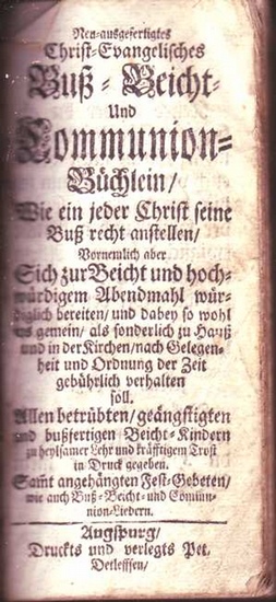 Neu-ausgefertigtes Christ-Evangelisches Buß- Beicht- und Communion-Büchlein / Wie ein jeder Christ seine Buß recht anstellen, Vornemlich aber Sich zur Beicht und hoch-würdigem Abendmahl [...] verhalten soll [... ] Sam[m]t angehängten Fest-Gebeten, wie auch Buß- Beicht- und Communion-Liedern . Augspurg (Augsburg), Detleffsen, 1719. 8°schmal. 382, 106 S. Original-Lederband d. Zt. (Einband sehr stark berieben u. bestoßen, Hinterer Buchdeckel gebrochen, wenige Seiten fleckig bzw. rostfl., Vors. fehlen, tlw. eselsohrig).)