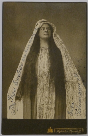 Original-Fotografie im Kabinett-Format vom Hofatelier Pieperhoff, Halle. Von Ernestine Schumann-Heink mit blauer Tinte auf der Bildseite eigenhändig signiert, gewidmet und datiert: "1896 / 1911 Frau Einstein zur Erinnerung a Erda Schumann-Heink". _. Ca. 14,5 x 10,3 cm (Fotografie), ca. 16,5 x 10,5 cm (Untersatzkarton). Rollenfoto als Erda. Die Fotografie entstand wohl während der Bayreuther Festspiele 1911.