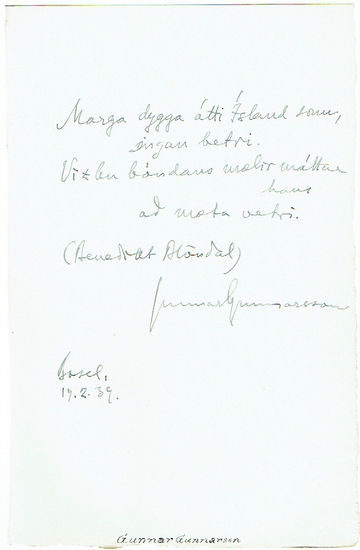 Eigenh. Gedichtmanuskript m. U. Basel, 19. II. 1939. 8vo. 1 p. (225 : 150 mm). Büttenpapier. Vier Zeilen auf isländisch aus ?Benedikt Blöndal?.