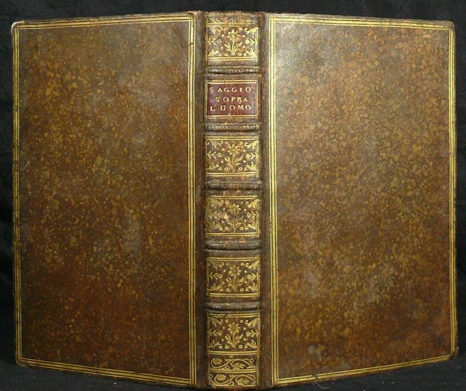 Saggio sopra l'Uomo. Poema filosofico. In tre Lingue Inglese, Francese, e Italiana. Nuova Edizione notabilmente accresciuta, e ornata di Figure. Mit gestochenem Frontispiz, gestoch. Titelvignette, 4 Kupfertafeln und 10 Vignetten im Text. Neapel, auf Kosten von Domenico Terres 1768. 8°. XXXV, 144 [recte 344] S. Geglätteter Lederband der Zt mit Deckelfileten, Kanten- und reicher Rückenvergoldung, Rückenschild. Wenig berieben, Ecken teils durchgerieben. Kl. Löchlein am Rückenbezug. Durchgehend mäßig stockfleckig, wenige Bll. stärker gebräunt. Titelblatt im weißen Rand mit kl. Ausriß, ein weiteres Bl. dito. Geringf. 'Kellergeruch'. Dreisprachige Ausgabe, basierend auf Pope's 'Essay on Man'.