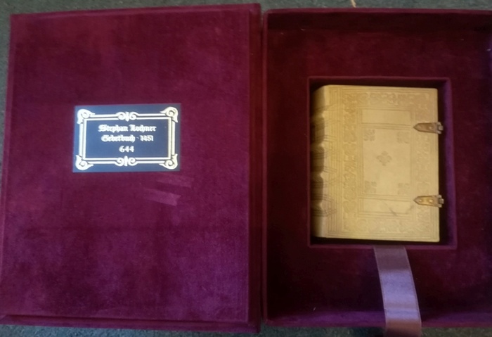 Gebetbuch - 1451. [Reprographische Nachbildung der] Handschrift 70 der Hessischen Landes- und Hochschulbibliothek Darmstadt. [1] [Faksimileband]. [2] Kommentar fon Eberhard Hönig. Mit Beiträgen von Kurt Hans Staub und Beate Braun-Nier. Lachen am Zürichsee - Stuttgart, Coron-Verlag in Zusammenarbeit mit dem Verlag Müller und Schindler, (1989). 2 Bände in einer in bordeauxrotem Samt ausgeschlagenen Originalkassette mit eingelegter Miniaturreproduktion auf dem Vorderdeckel und goldgeprägtem Titelschild mit Nummerierung auf dem Innendeckel; [1] Original-Leder mit Blindprägung auf 4 Bünden mit 2 Messingschließen und Farbschnitt; 12°; 235 (1) Blätter (mit allen Miniaturen des Originals komplett farbig reproduziert); [2] Original-Pappband (in Pergamentoptik) mit Titelgoldprägung und eingelegter farbiger Miniaturreproduktion; 8°; 188 Seiten; mit Textabbildungen (diese teils farbig). Präzise Nachbildung des dem spätmittelalterlichen Maler Stephan Lochner zugeschriebenen und kunstgeschichtlich bedeutsamen Stundenbuches. Nummeriertes Exemplar (Nr. 644). Sehr gutes Exemplar in der ursprünglichen Styropor-Umverpackung.