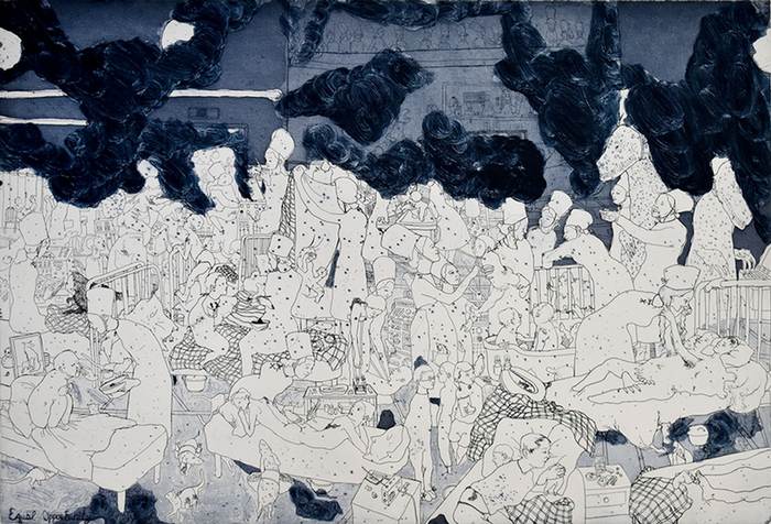 Egual Opportunity. [2005]. [ Signierte Original-Farbradierung / signed original etching]. _. Dasha Shishkin, geboren 1977 in Moskau, immigrierte als Teenager in die USA/New York und studierte an der Parsons School of Design. Original-Farbradierung auf 270 g/qm Hahnemühle Bütten. Druck durch Kunst- und Radierwerkstatt Willi Jesse, Inh. Detlef Jäger, Berlin. Rückseitig von Dasha Shishkin in Blei signiert. Edition der Griffelkunst-Vereinigung Hamburg, 2005. Griffelkunst, Verzeichnis der Editionen 319 B4. Maße Blatt/Abbildung: 41,0 x 61,0 cm. Sehr gutes Exemplar. Original color etching on 270 g/sqm Hahnemühle handmade paper. Printed by the art and etching workshop Willi Jesse, owner Detlef Jäger, Berlin. Signed in lead by Dasha Shishkin on the reverse. Edition of the Hamburg Griffelkunst Association, 2005. Griffelkunst, Index of Editions 319 B4. Sheet/image dimensions: 41.0 x 61.0 cm. Very good copy.