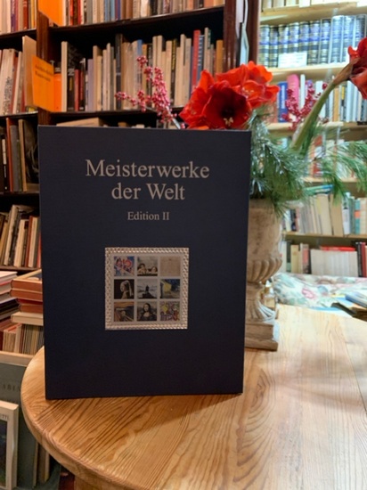 Meisterwerke der Welt II. Faksimile. Diese exklusive Ausgabe beinhaltet eine Premium Auswahl zeigenössischer Meisterwerke inklusiv detaillierter Informationen und Abbildungen. Willkommen in der faszinierenden Welt der "Meisterwerke der Welt"! Tauchen Sie ein in eine außergewöhnliche Sammlung bekannter Meisterwerke, präsentiert von renommierten Künstlern. Dabei wurde auf ein innovatives Sublimationsdruckverfahren zurückgegriffen, das die Kunstwerke auf langlebige Chromaluxeplatten überträgt und somit ihre Schönheit für die Ewigkeit konserviert. Limitierte Auflage von 1999 Exemplaren.,. Wiesbaden, EBKM Exclusive Buch & Kunst Manufaktur GmbH ohne Jahr. Jede Chromaluxeplatte (5 Stück) hat die Maße 300 mmx400 mm und bildet somit den perfekten Rahmen für diese herausragenden Kunstwerke., Imp.-Folio. Der Einband der Kassette wurde aus blauem Leder gestaltet und auf der Mitte des Kassettendeckels wurde eine Auswahl der Bilder drapiert., Imp.-Folio: blaue silbergeprägte OLeinwand mit 4 silberfarbenen Schrauben.,. Inhalt: Das blaue Pferdchen von Franz Marc. Der Wanderer über dem Nebelmeer von Caspar Friedrich. Winterlandschaft von Wassily Kandinsky. Mona Lisa von Leonardo da Vinci. Sehr gutes neuwertiges Exemplar.