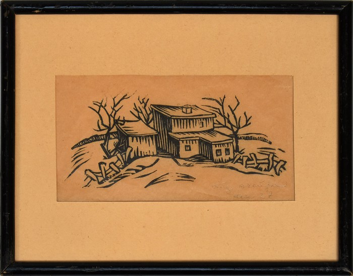 Freistehender Hof. [19]27. [Signierte Original-Grafik, gerahmt / signed original graphic art print, framed]. _. (August Preuße, geb. 22.03.1908 in Höhscheid, gest. 09.03.1942 in Russland. Ausbildung an der Fachschule für Metallgesta Original-Grafik von August Preuße auf dunklerem Papier, unterhalb der Abbildung mit Bleistift signiert und datiert ('27). Im schwarzen Holzrahmen hinter Glas/Passepartout gerahmt, rückseitig mit einem Haken zur Aufhängung. Nicht ausgerahmt. Maße Abbildung: 6,3 x 14,0 cm. Maße Rahmen: 18,0 x 22,3 cm. Provenienz: Aus dem Nachlass des Kunstsammlers und Autors Ralf Seilheimer, Rahmenrückseite mit kleiner handschriftlicher Nummerierung. Rahmen mit Gebrauchsspuren. Insgesamt sehr guter Zustand. Original graphic art print by August Preuße on darker paper, signed, and dated ('28) with pencil below the illustration. Framed in a black wooden frame behind glass/passepartout, with one hook for mounting at the backside. Not examined out of frame. Dimensions illustration: 6.3 x 14.0 cm. Frame dimensions: 18.0 x 22.3 cm. Provenance: From the estate of the art collector and author Ralf Seilheimer, backside of the frame with a small handwritten number. Frame with traces of use. Overall fine condition.