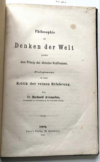 Philosophie als Denken der Welt gemass dem Princip des kleinsten Kraftmasses. Prolegomena zu einer Kritik der reinen Erfahrung. Leipzig, Fues, 1876. XIII, 82 Seiten. Halbleinwand d. Zt. (leicht berieben, ob. Kapital mit kl. Läs.). Erste Ausgabe der Habilitationsschrift. - Ziegenfuss I, S. 57-58: "Die Philosophie von Avenarius ist als "Empiriokritizismus" eine prägnante Ausgestaltung des Positivismus. Er hebt alle Unterschiede zwischen der inneren und äußeren Erfahrung auf und will alle metaphysischen Bestandteile aus der Erfahrung ausgeschaltet wissen. Die "reine " Erfahrung ist sein Ziel." - Gelegentlich leicht stockfleckig. - Aus der Bibliothek von Prof. Pepperle mit seinem Besitzvermerk auf Vorsatz und einigen Anstreichungen und wenigen Notizen in Bleistift. A2-280.